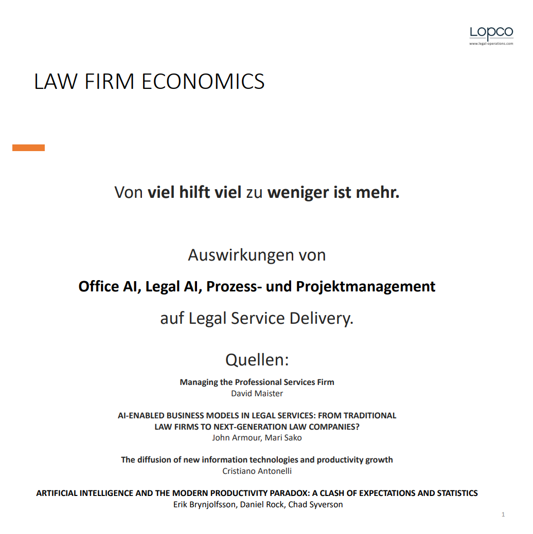 Methoden und Tools aus der IT und der allgemeinen Betriebswirtschaftslehre werden unverzichtbar, in Rechtsabteilungen und Kanzleien. Aus Legal Operations wird Operations für den Rechtsmarkt. Wir nutzen Methoden und Kompetenzen, die in anderen Branchen und Abteilungen teils seit Jahrzehnten etabliert sind.